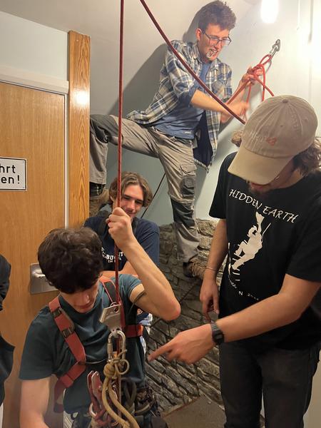 Fortunately for us, Davy’s group had returned earlier, and they were already making dinner when we arrived. We all ate and chatted for a while, and then Thurston and Chris taught newcomers pot & sling. After a rather chaotic (and impressive!) game, Dylan, Thomas and I decided that the midnight to 3am window was the optimal time to learn SRT. We rigged some ropes along the stairwell (Thurston taught me to tie an alpine butterfly the 'bad way', apparently) and through the hatch in the floor to the basement, and I learned ascending, descending, rebelay, deviations, and changeovers, all from Chris with his glass of mulled wine in hand. It should be noted that Chris’s gear is different from the club’s, and descending was... fast.