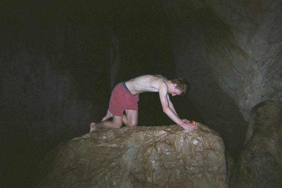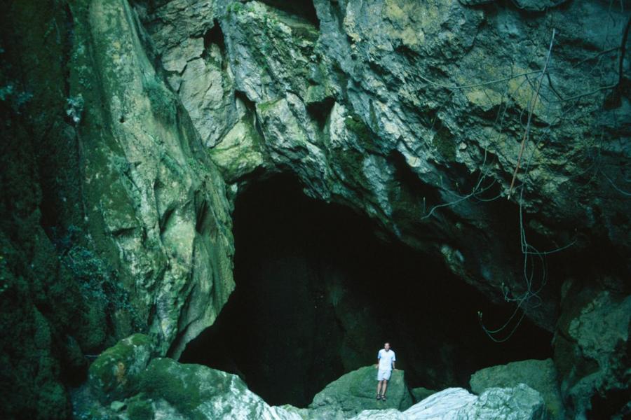 This is a cave with a large entrance (ca. 60 m high) quite close to a road. As there it's obvious, there were large numbers of coaches taking tons of people to the cave. We intended to pirate this cave, so we came back later in the day after a spot of dossing when no one else was around.