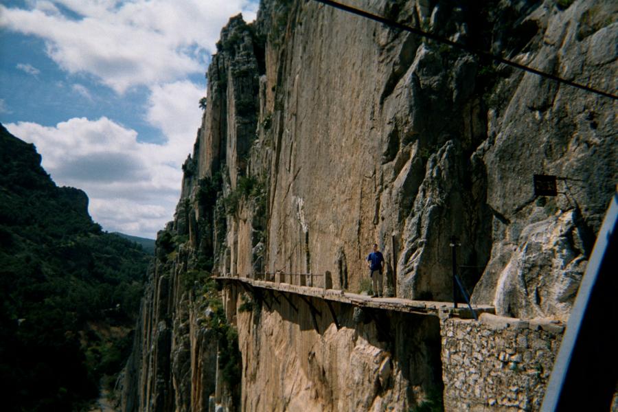 I think we went past IC Mountaineering Club when we were there, but they were too scared to go over it. A number of things would have made this less scary. Less holes in the floor, a handrail, no whistling wind, bit less rust, I could go on. Glad I did it though. El Chorro is actually Garganta del Chorro, a giant canyon a few hundred metres deep. We think the walkway was built during the construction of the railway which follows a series of tunnels parallel to the river. Over the years it has fallen into a small bit of disrepair, but the Spanish don't seem too worried about letting people over it.