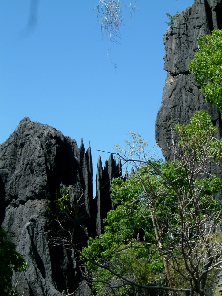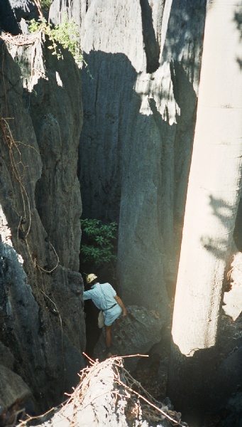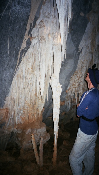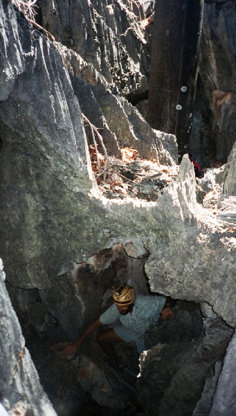 At 7am, Mark the club secretary and guide for the morning, arrived to take me caving. Consciousness hadn't quite reached my brain, I gulped down my coffee and we headed off on the gravel roads at high speed. In his battered 4X4 along the way he explained there were about 500 surveyed caves in the area, but we couldn't do the main caves as they were inside the national park and we didn't have permits. But he was keen to explore a shaft he had discovered with is son he didn't think anyone had been down. We eventually came off the road onto a vague track into the bush weaving through big termite hills, headed towards two lumps of tower karst. When we reached the right hand lump we continued on foot, around the base there were several holes which Mark looked at with interest, and I looked at with unease. The holes were all guarded by webs, spanned right across and about 5 deep, each holding a fat spider with distinct black and white stripes. We then turned and started clambering through thick bush and over rocks making our way up to the left hand lump, it was pretty spiky stuff, on a couple of occasions I was walking over rocks which would have quite happily diced me up if I slipped. We eventually found the shaft and chimneyed the first bit, the rock was very grippy. A very convenient natural then allowed us to rig the ladder down, with another bit of a climb at the bottom. At the bottom Mark had good and bad news, the cave seemed to continue under a rock arch unfortunately there was a cairn, someone had already been and surveyed the cave probably coming in from a different way.