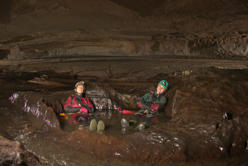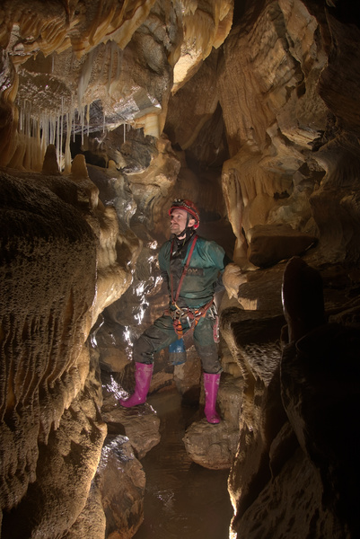 Here we were glad to climb above the scary streamway into the top of the passage, which was now hourglass shaped. And truly hourglass shaped, as it was narrow and walking height on top, with a constriction beneath, and then the stream below. It’s hard to describe but I’m not sure I’ve seen anything quite like it.