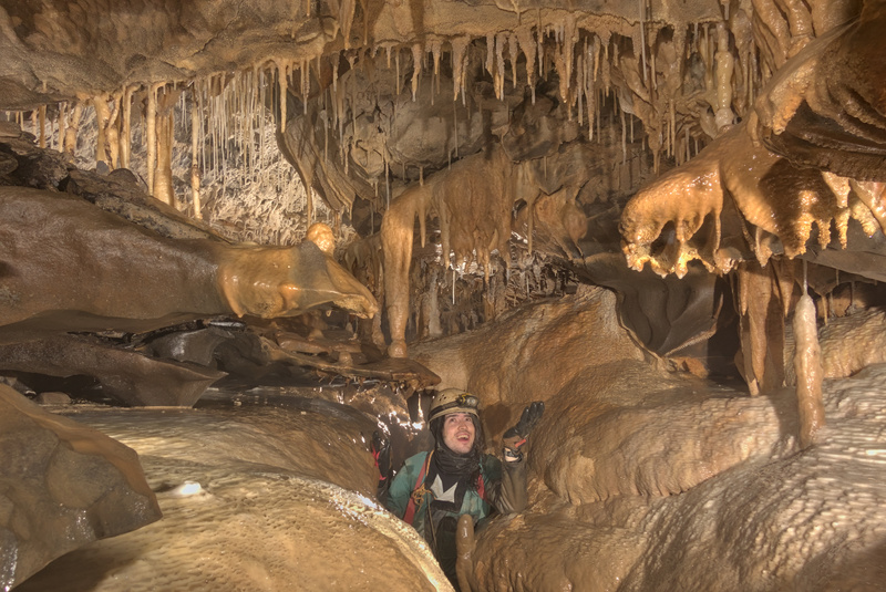 The top two thirds of the cave are a narrow, tortuous streamway. Some found this tedious but it is my favourite kind of caving, walking sideways between the scalloped walls and climbing small cascades. There wasn’t much stooping and crawling and as we descended into the cave the formations and decorations got better and better. The entire way in we were ooo-ing and aaa-ing at each corner when a new formation came into view.