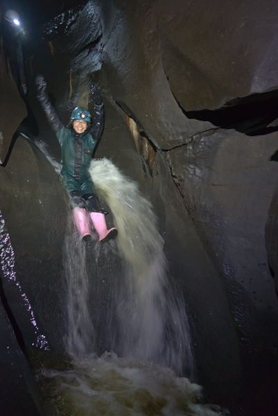 Down the second pitch – near the bottom Diss hid in a small alcove to stay dry, but I was keen to get to the very bottom. Clearly it looked immensely worth it as she followed through the water straight after. I didn’t think people were going to continue down the extensions so wanted to have a quick peek before turning around. A series of fun free climbable cascades led you from pool to pool, eventually reaching a semi-submerged duck which I didn’t fancy. Clearly I sold it very well to the others once back at the pitch as everyone but Robin went down. I was to leave with him as we were running short on time, but I quickly had a cheeky look into the northern passage while he was prussiking up. The entrance is completely obscured by the waterfall but walking straight into the wall magically reveals an alcove that leads on to passages similar to the southern branch. Well worth looking at if you have time just for the cool entrance.