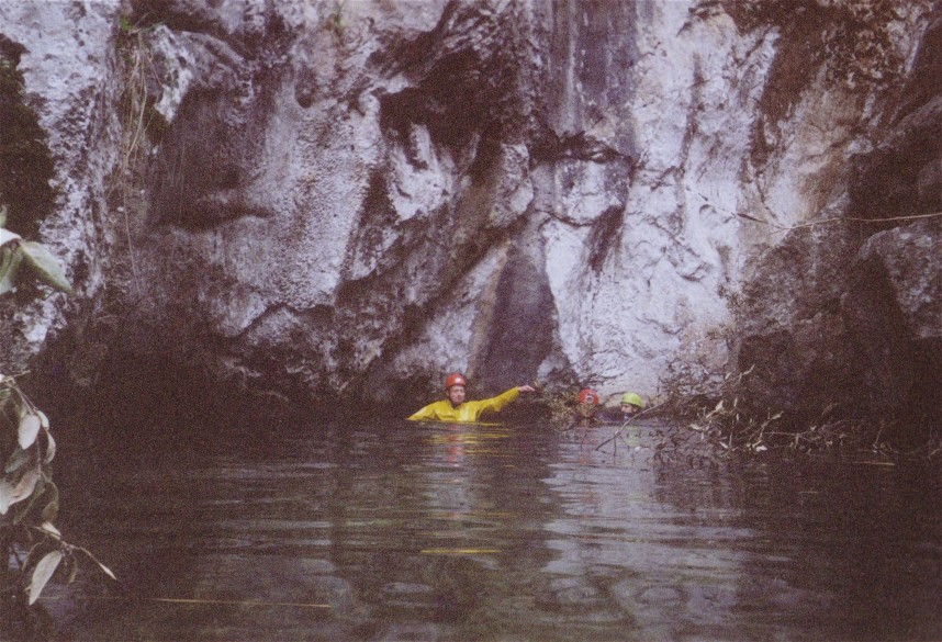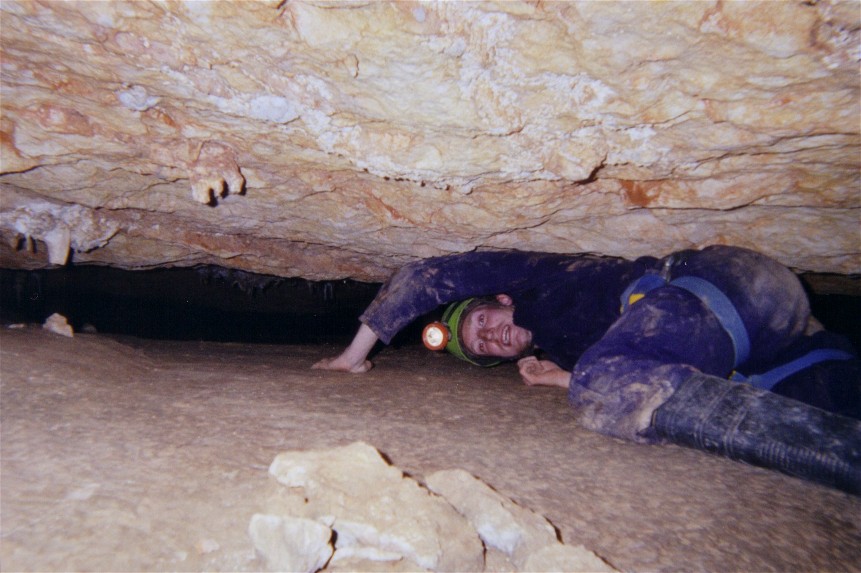We then decided to go deeper and rigged a long slope, with "some formations". Andrew was first, rigged round a column, but run out of slings and so connected the ends as kind of a Y-hang. After a while he realised, he had passed some sign. "What does P-E-L-I-G-R-O-S mean?" (Danger). It got smaller and smaller there, Clewin tried his best, but he ran out of rope, before he reached the bottom of that pitch. It is a pity we never saw the end of a cave!