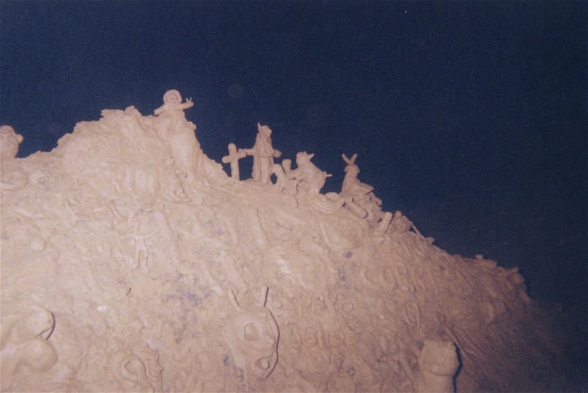 The cave entrance is a bit comic style, with stalactites and stalagmites like giant dragon's teeth. A squeeze between two columns leads to the bone chamber, which has the shape of a bowl, only the wrong way round, again curtain of stalactites in the strangest shape, growing down, sideways and up again. I know if you read this, it gets a bit boring now, so if I write "some room" or "some decorations" from now on I mean: In England thy would charge you a tenner to look at that.