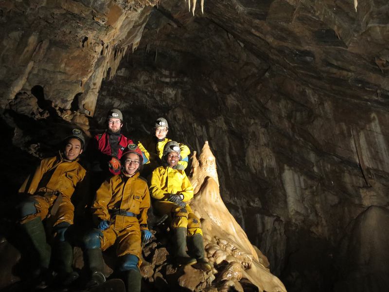 We went down the hole in the floor to Rift passage, and then followed another hole in the floor down to the Gallery, where we took more pictures overlooking the Main Chamber. My flash couldn't light up the entire expanse, but I could get the 3m long stalactites in the foreground with the group underneath. We then went down to the main chamber via the Oxbow, and checked out the grim sump.