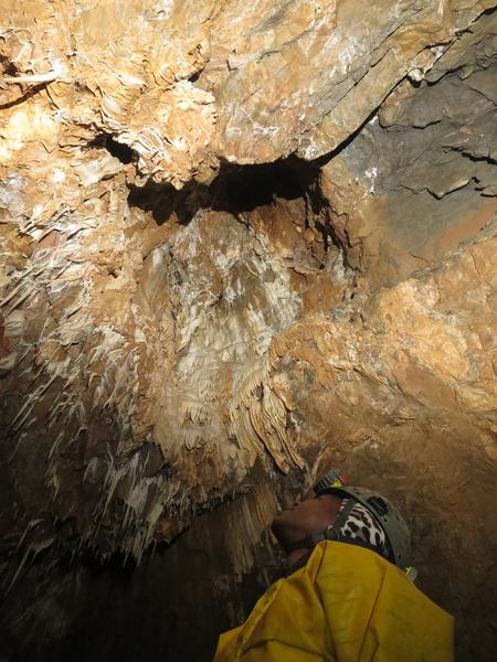 Down inside, we took the flat out crawl on the left and then the free climbs on the right. My group were impressed by the scale of the Gorge, and more so at the Main Chamber. Not wanting to try the wet free climb in the Main Chamber, we backed up and climbed over the Bridge, traversing round the pretty calcite on the left of the chamber and along until we reached the White Passage.