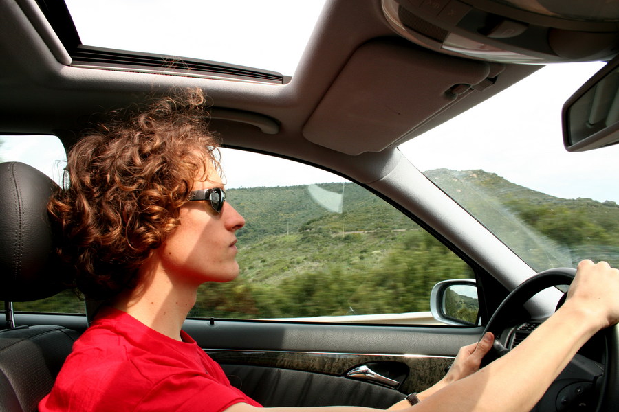 No sleep in Stansted, 5am flight. Arrive in cold blustery Sardinia & fight our way through passport control. Were it not for the Cacti, I wouldn't believe we were in the Mediterranean, rather some Prisoner-esque escapade in Port Merrion. The surrealism continues at the car hire place, where they tell us that due to a shortage of what we ordered, we get a free triple-upgrade to... a Mercedes E270! What? I'm 23? I wouldn't hire a Merc to me. Let alone in a country where they all drive on the wrong side of the road.