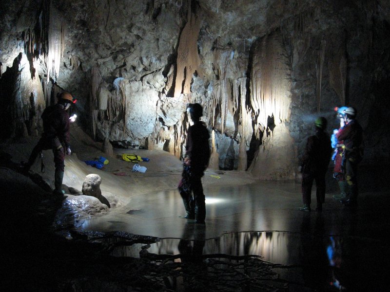 Heading off for Sahara; wonderful sand dunes of about 4-5 m height in a large passage (somewhere 20 m wide). Soon reaching the oasis, an active inlet in the middle of the sand, with really nice pools and stalactites, just the right time to fill up our water resources. Passing by the Black Hole is not that scary, but still we know that it is a 90 m deep pitch... finding the way to Conical Chamber, which is like a huge vertical cone of some 30 m diameter. After some crawl we manage to arrive to a huge chamber what we believe to be the Grande Frana, the last chamber of the cave!!! This being the ultimate goal, we feel really happy, get rid of the wetsuits and the excess fluid inside. Thara feels that this chamber is not big enough though, at least not as big as it should be; it is 'just' about 50 m long, while on the map the size is more than 300 ms. So we start to get to the end, and reach a place where we must stop: the thing in front of us is really hard to compare to anything in size we have seen before!! The lights reach nothing above us, the echo last for several seconds, and the left hand wall looks like going up to the sky! Where is all the rock missing from here? It is indeed really long and high, but we can't see the whole thing because of a huge hill in the chamber composed by fallen rocks of a height about 40 m. We start to ascend and realize that this might be the most dangerous part of the trip, as the whole hill is constantly running down from under our feet; we have been going on for more than 8 hours now so extra caution is needed, as nobody probably wants to rescue from this point of the cave.... somehow we manage to get to the top, I descend down on the other side to the end marked by a 15 m high dark stalagmite. Thara takes some photos of the big darkness, just to prove that we have seen it :-)