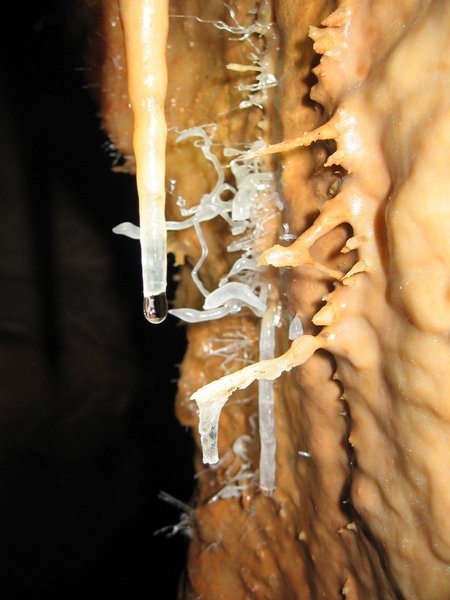 Once we squeezed through the gap in the locked gate we descended a twenty metre pitch/climb into the first chamber. Scrambled down and down until we found the stream-way. Water! We were all wearing wetsuits and the cave was warm, so the water and the wet duck that followed were most welcome. More small passage, then the cave really opened out and became much more inviting. Beautiful crystals glittering from flowstone rocks, pretty things hanging from the ceiling and mysterious still pools shaped like enormous gills. We got almost as far as the confluenza and then turned back.