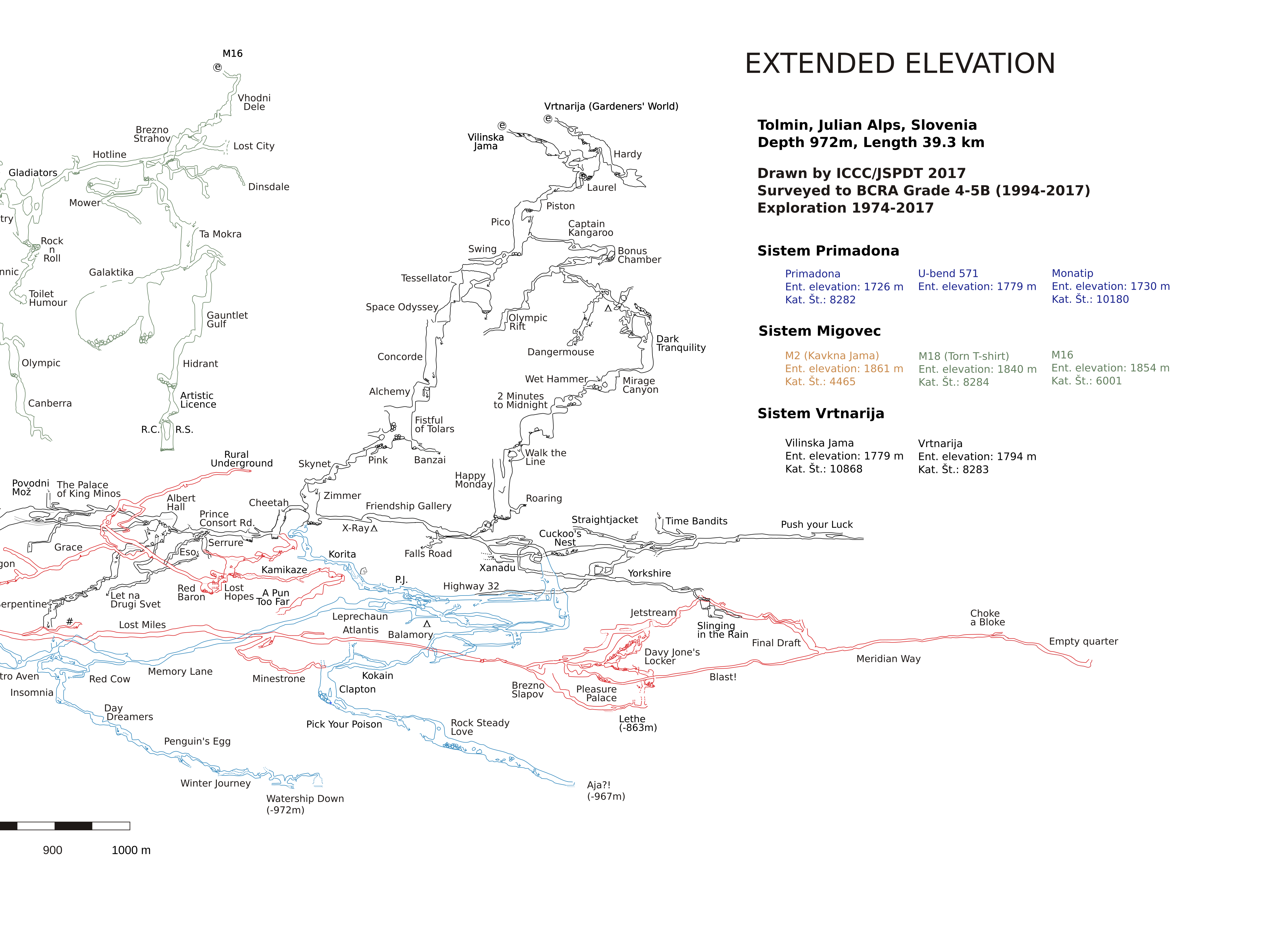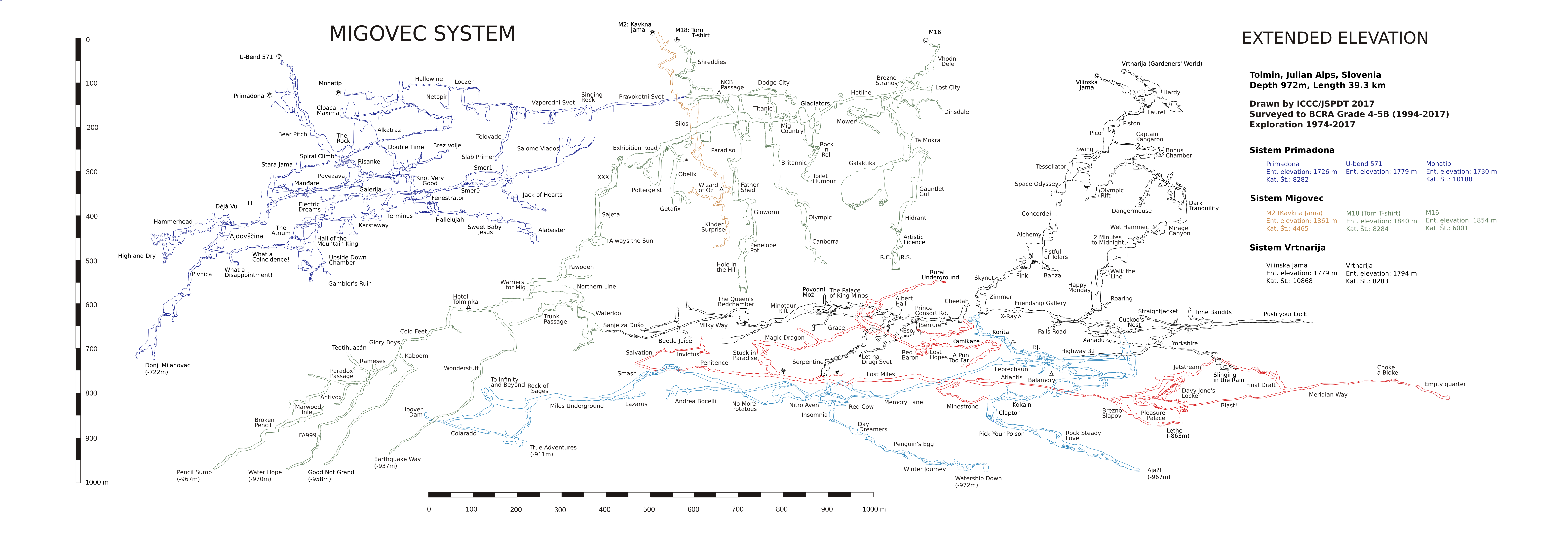 A new surface cave was spotted off a photograph and accessed via a short abseil off the western cliffs. Its leads were exhausted in a day due to its main emph being filled with shattered rock to the ceiling. The closest approach with the Migovec system lie in Monatip, not 100m away. Many similar entrance on the cliff side remain to be thoroughly investigated. All in all, the 2017 Cez rob expedition was a success, with the discovery of more than 1886m of new passage, involving four novices and taking place both in the established cave system as well as new areas of the Migovec plateau. The outlook for 2018 is good, with the likely set-up of a new underground camp in the deep passages of Primadona.