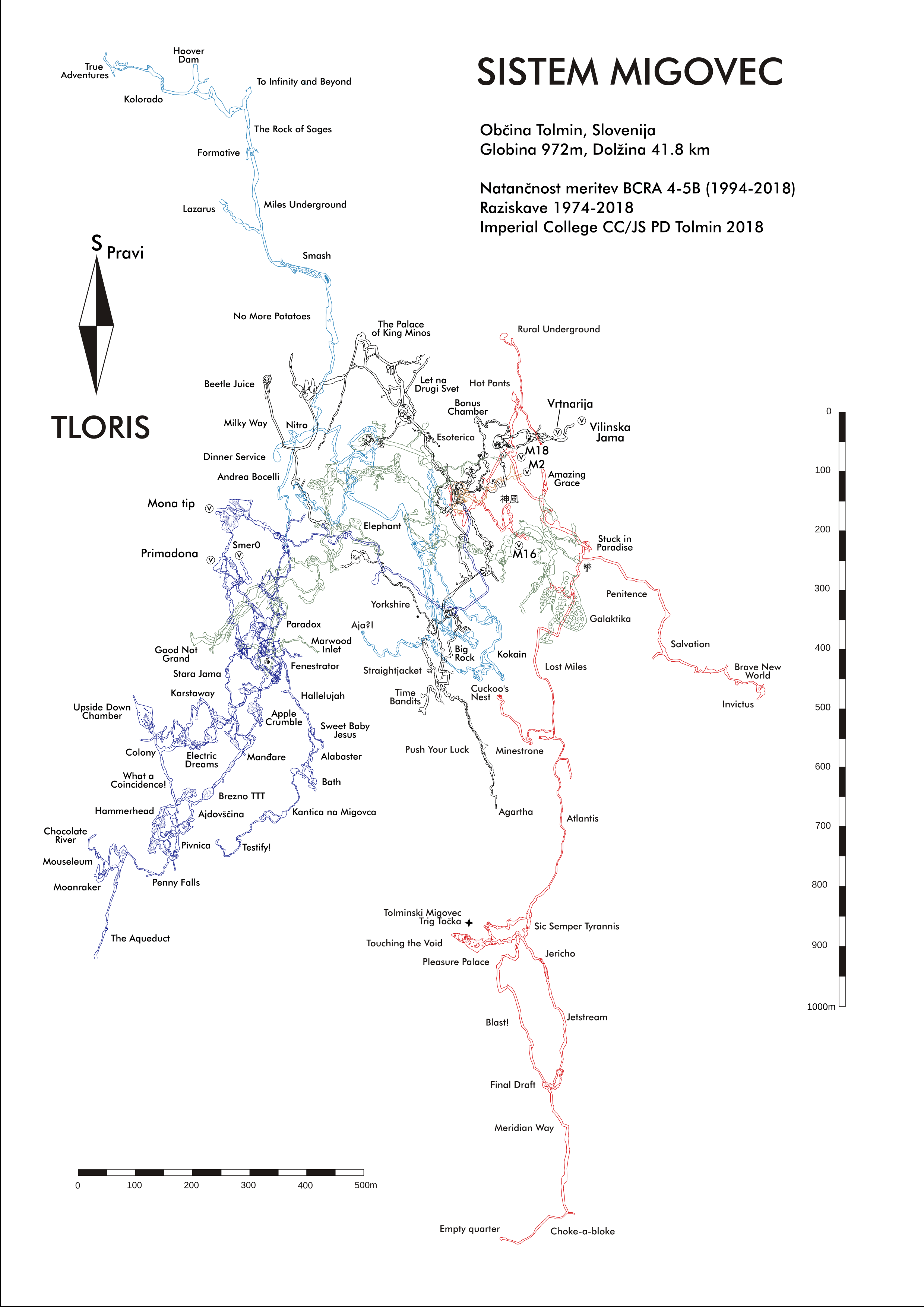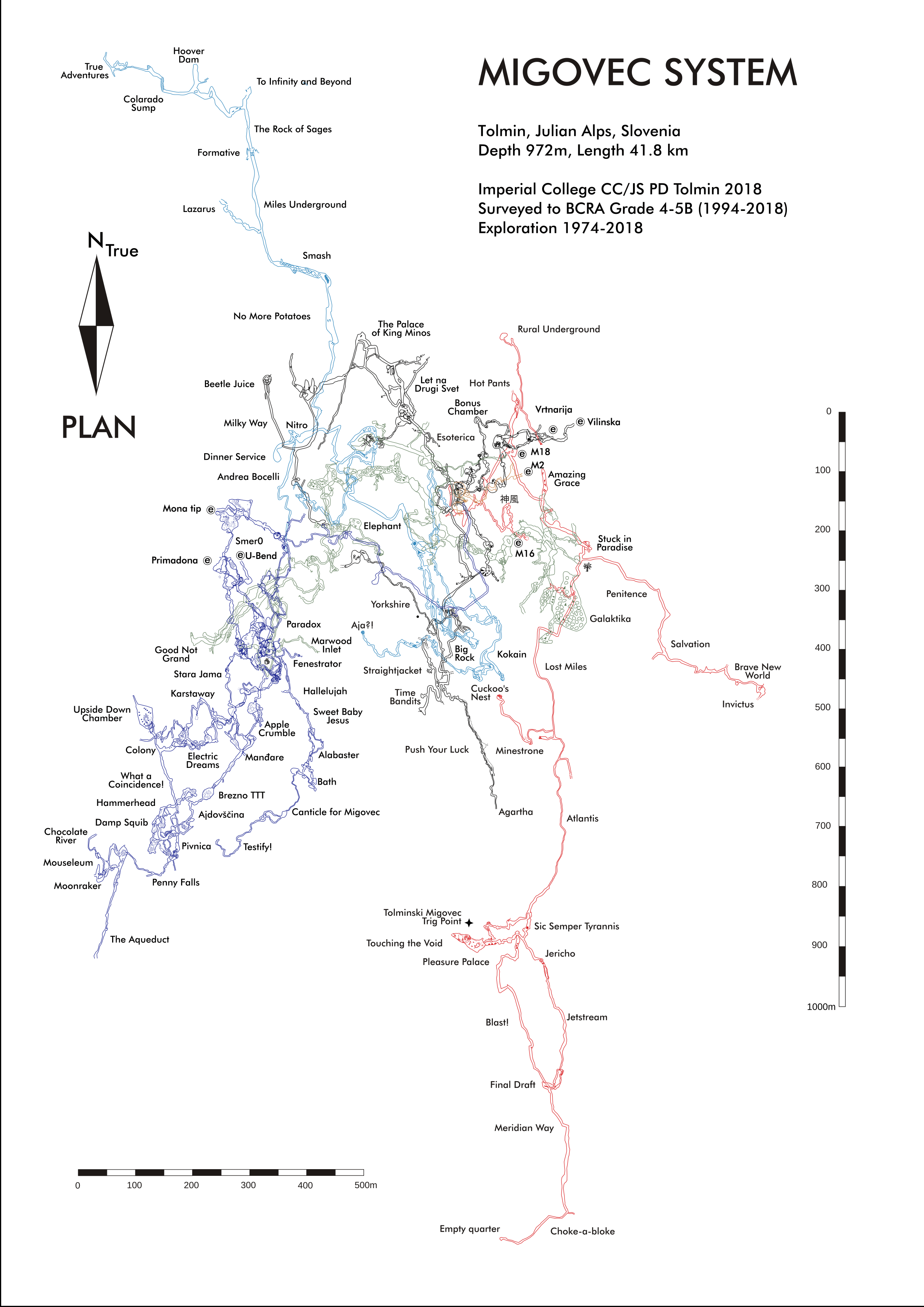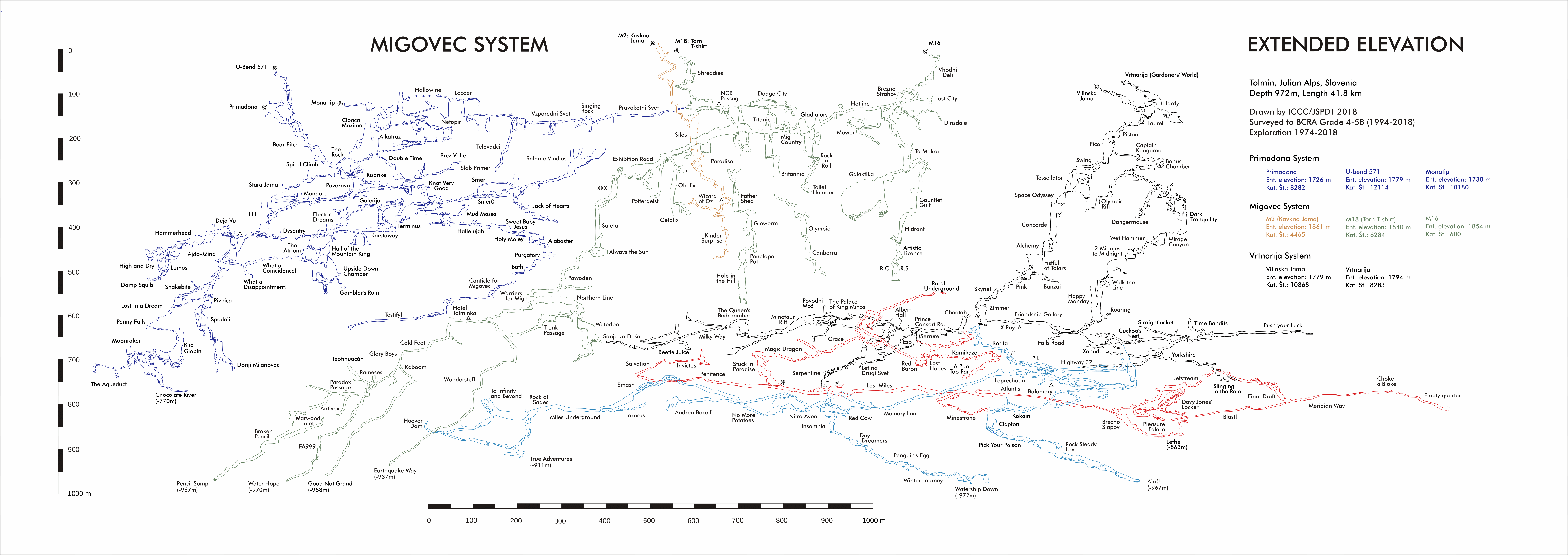 The Klic Globin expedition took place between Friday 6th July and Sunday 12th August 2018. In total a group of ICCC and NUCC cavers, 30 strong came out for five weeks on the Migovec Plateau to continue the exploration of Primadona, within the Tolminski Migovec Cave system. The main achievments of the expeditions are the setting up of an underground camp at the bottom of TTT pitch, connected to the surface with a functional Cave-Link text messaging system. This was a springboard from which deep exploration below Pivnica (old Slovene deep route) took place, culminating with the finding of a significant, and now deeper, branch containing pitches large and small, and the promise of both further depth (200 m to go to the presumed water table) and perhaps significant horizontal passage. The Alabaster branch was also further extended south, gaining nearly 800 m of new passage, and breaking the -600 m below M2 mark. Surface action successes include the exciting breakthrough in Coincidence Cave, gaining 40m of new cave, and confirming its outstanding potential through consistently strong draught.