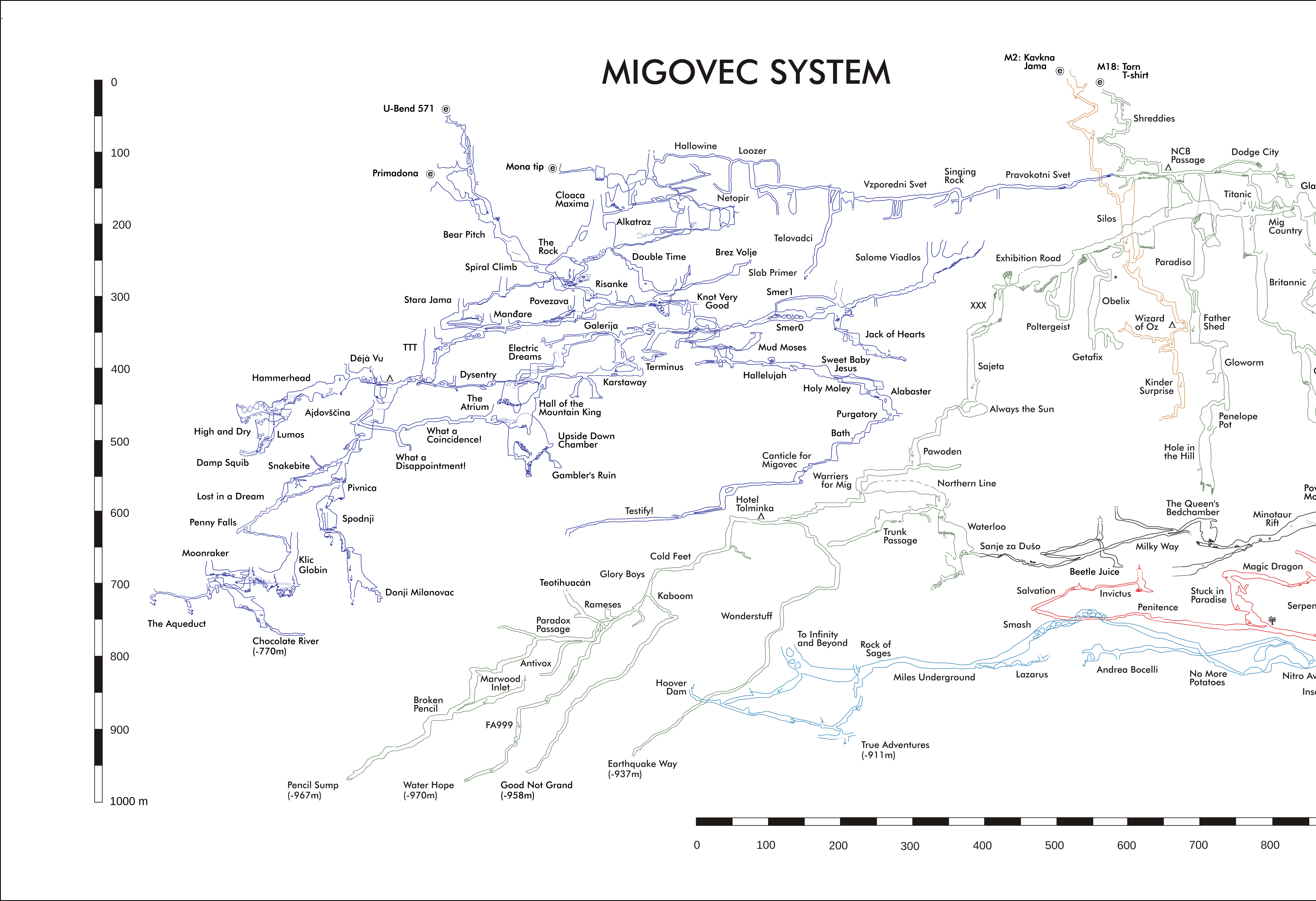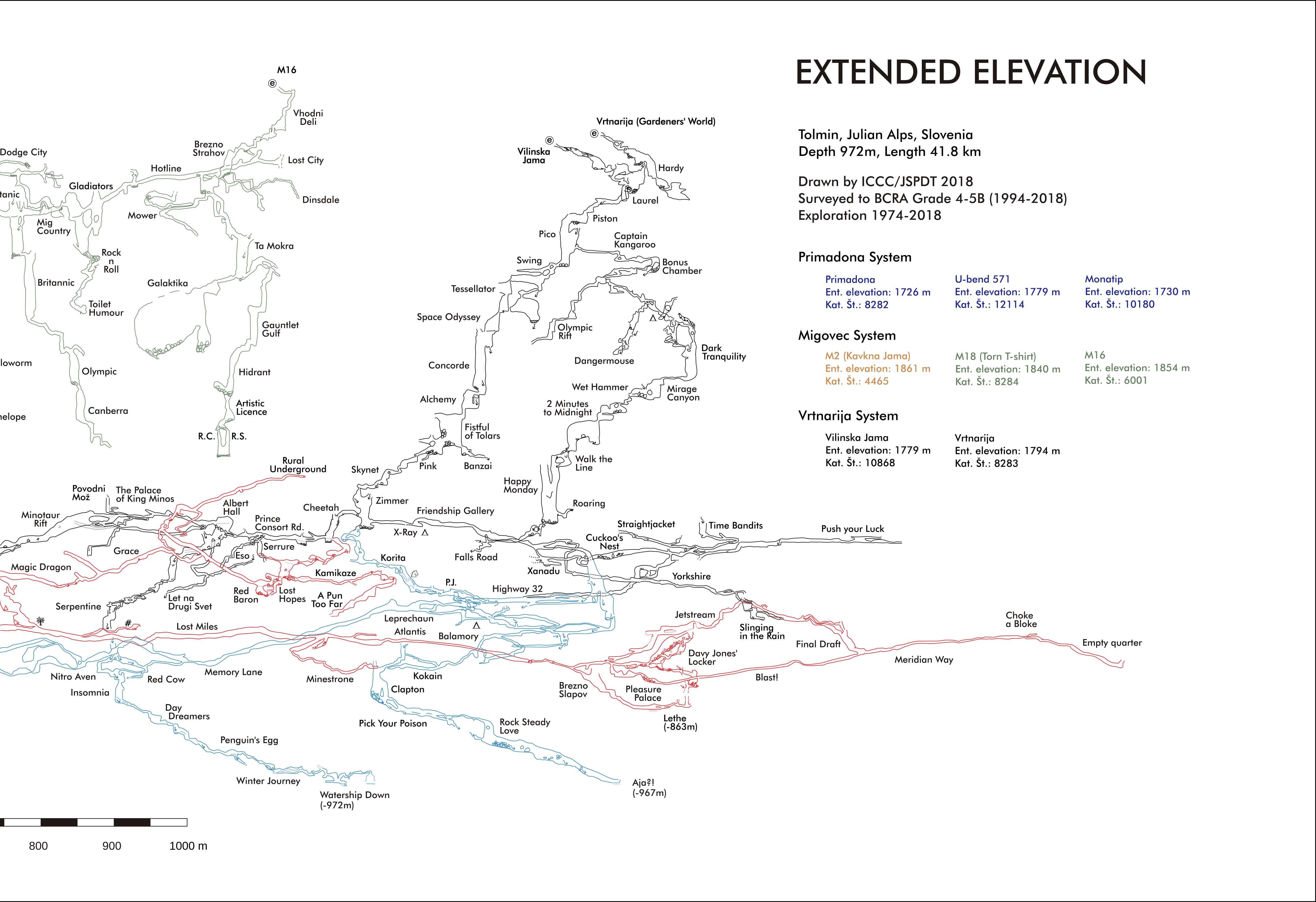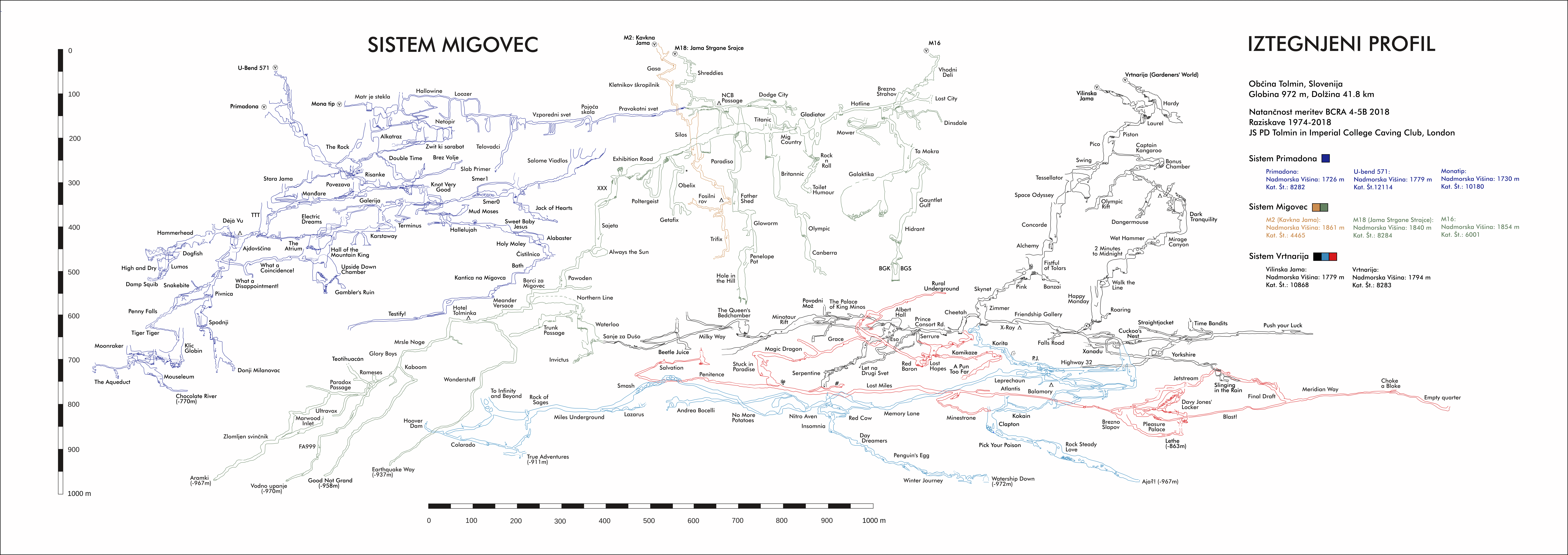 The Klic Globin expedition took place between Friday 6th July and Sunday 12th August 2018. In total a group of ICCC and NUCC cavers, 30 strong came out for five weeks on the Migovec Plateau to continue the exploration of Primadona, within the Tolminski Migovec Cave system. The main achievments of the expeditions are the setting up of an underground camp at the bottom of TTT pitch, connected to the surface with a functional Cave-Link text messaging system. This was a springboard from which deep exploration below Pivnica (old Slovene deep route) took place, culminating with the finding of a significant, and now deeper, branch containing pitches large and small, and the promise of both further depth (200 m to go to the presumed water table) and perhaps significant horizontal passage. The Alabaster branch was also further extended south, gaining nearly 800 m of new passage, and breaking the -600 m below M2 mark. Surface action successes include the exciting breakthrough in Coincidence Cave, gaining 40m of new cave, and confirming its outstanding potential through consistently strong draught.