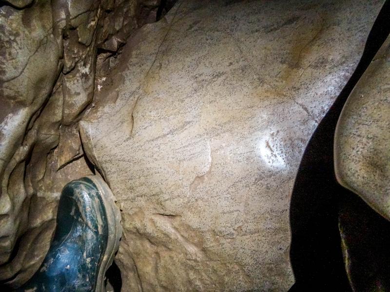 More stomping and we found a far more obvious left turning and it finally did match the description. From here on in we were faced with the fearsome sand swims. These were weird. Given the tunnels were all phreatic, the water seemed as though it didn't care in the slightest which direction it headed in. The tubes varied from stooping height to about crawling-sized but would zig-zag up and down so drastically that the bottoms had sumped out with sand. These had been dug through, leaving the bare minimum amount of space for a human to squeeze through and begin digging the next one. Getting to Trafalgar involved many many sand swims.