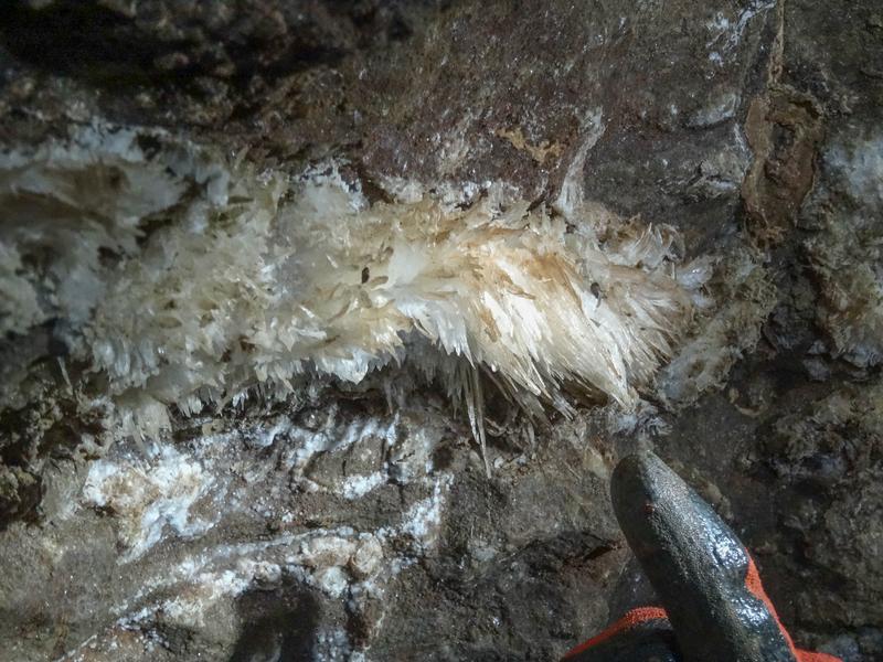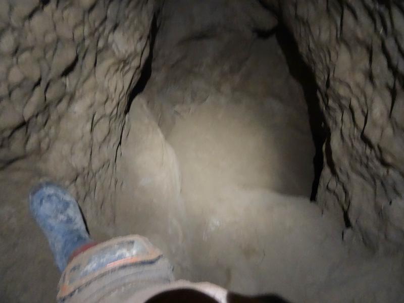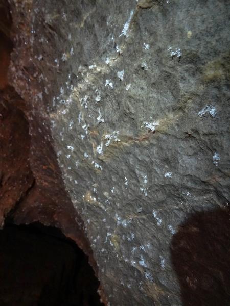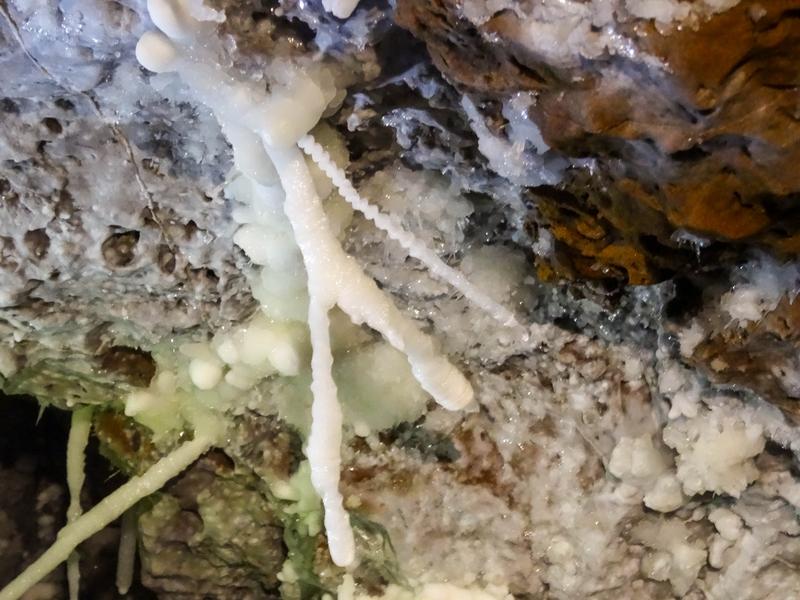 Approaching each one without knowing the exit strategy was a recipe for twisted spines and aching backs as often they descended so steeply that you couldn't go head first, only to ascend just as steeply on the other side so you couldn't go feet first. This meant most of them were best tackled going down on your back, head first so that you could climb up the other side. However, this meant that the endless sand would enter every orifice and that much sand had to be removed from our ears. As if these weren't weird enough, the walls were often covered in the same glittering crystals as earlier, and occasionally white blobby crystals were scattered across the walls as if the cave gods had sneezed into their cereal bowl of calcite crispies. Occasionally there would also be silvery patches of crystals that were even shinier still, like high-vis patches of clothing on the dark cave walls. So weird!