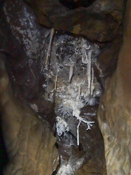 While waiting around, one invited us to go see the Courtesan, as it was just a few meters away. He disappeared down the tiny squeeze we'd assumed went nowhere and shot up into the roof of it as we looked on in surprise. I followed and Julien and Davey afterwards, and as we writhed our way out the top of the tiny rifty tube we were presented with an incredible stal, coated in wiry spindly helictites growing off in every imaginable direction. Some of these had grown their own stals, and the chamber behind was full of other weird and amazing pretties as well.