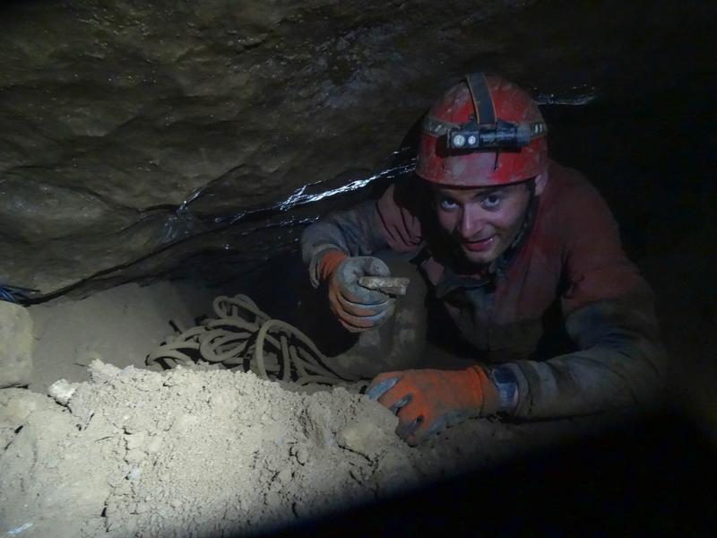 All this was done in a crawling-height passage just wide enough for the two of us. Pulling was incredibly awkward, and although I tried to deepen the sandy floor it took far too long and the call of "HAUL" from the front was too fast for us to achieve much else between shifts. After a dozen or so trays, Julien was exhausted and tapped out, soon followed by Paul emerging from the front who had hit himself in the face with the crowbar in his excitement. Despite the bleeding, he was completely fine, don't worry.