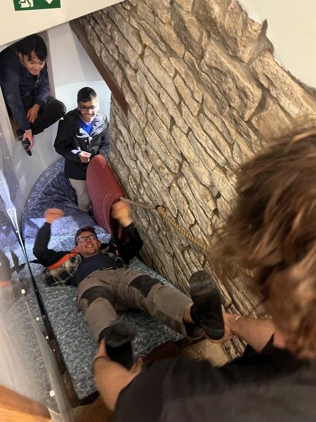 Fortunately for us, Davy’s group had returned earlier, and they were already making dinner when we arrived. We all ate and chatted for a while, and then Thurston and Chris taught newcomers pot & sling. After a rather chaotic (and impressive!) game, Dylan, Thomas and I decided that the midnight to 3am window was the optimal time to learn SRT. We rigged some ropes along the stairwell (Thurston taught me to tie an alpine butterfly the 'bad way', apparently) and through the hatch in the floor to the basement, and I learned ascending, descending, rebelay, deviations, and changeovers, all from Chris with his glass of mulled wine in hand. It should be noted that Chris’s gear is different from the club’s, and descending was... fast.
