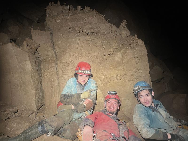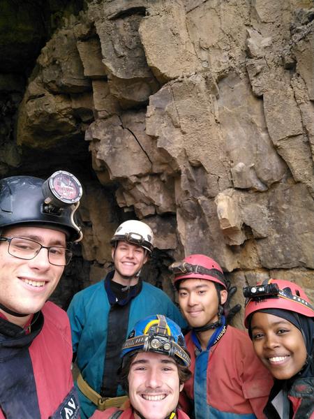 Saturday morning I was awoken by sheep. Who I proceeded to ignore until I woke again due to the much more aggressive sound of someone (Thurston?) banging pots and pans together at the ungodly hour of 9-something in the morning. We took the first few hours fairly slow, with a long drawn-out breakfast, and set off for the caves around midday. There were three groups, two in Aggy and one that took Davy’s car to a different system. Thurston, Thomas, Aditya, Zheyi, Chris and I went in the first Aggy group, and everything started off really well, with plenty of rock scrambling but nothing too difficult. We got lost only once en route to the first large chamber, and then again at 2nd choice, which somewhat delayed our progress. After a difficult climbing section with ropes, we were getting close to the turnaround time, and Thurston, Thomas and I decided to rush a little bit to try to make it to Straw Gallery. While taking what I will call a 'calculated risk', I jumped down into the water after Thurston. Unfortunately I had miscalculated the depth (consequences of basing your movements on someone nearly two feet taller), so I slipped and wound up soaking wet. We pressed on through the streamway, though, until slightly past our turnaround time. (Later that night, we discovered that we had made it past Straw Gallery, but we forgot to actually look up, so none of us saw it.) We backtracked and met up with the others (Chris kindly lent me his bivvy bag for the colder moments) and climbed back towards the first main chamber, where we met up with Ben’s group for a photo. Then we all made our way towards the exit, and accidentally split into two unplanned groups that exited about 45 minutes apart.