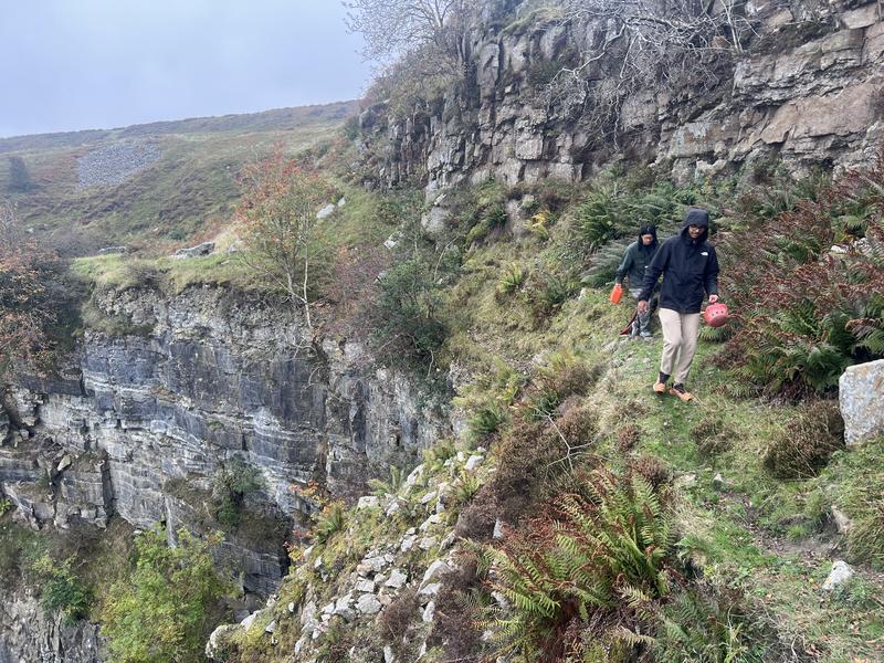 We had some extra time so decided to explore the quarry. The first thing we came across was a large, brick shaft. After shouting to the group below from the top of this shaft, we made our way down the hill to join them at the bottom. Some tobogganing attempts were made. Dylan, with his stroke of bad luck this weekend, sustained his second bruise after sliding over a large rock in the grass. But he carried on like the resilient caver he is. The bottom of the shaft housed a teeny tiny cave. Inside the walls of this cave(?) is a small shark fossil.