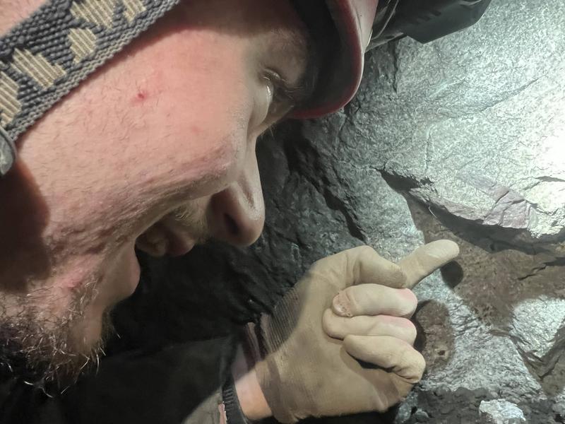 An ICCC badge was created, a photo taken with it, and the rest of the chamber was given a cursory glance before we headed out to the others who had been waiting for us. The start of this dig is a perfectly human-sized tube, for about 5 m, in which I led the way. Zooming along since the others were waiting for us, I froze. Mid crawl, unable to turn my head or look ahead of me, out of nowhere, something grabbed my hand. My heart stopped until Perry burst out laughing directly ahead of me, shocked that I'd not noticed him at all. Well played, sir. I thought the cave monsters had finally come for me, but thankfully I could put my ice axe back in my bag.