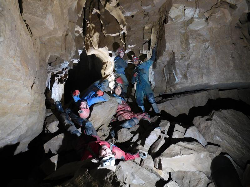 Onto Aggy itself, and we made rapid progress on the entrance series, catching up on the team ahead by the boulder choke. We all congregated in Baron's chamber, with some lying down and the classic lights-off experience. Perry seemed to particularly enjoy the lie-down. After waking everyone up, we wandered over to a side passage I'd wanted to investigate - Erse Passage. Or the Erse hole, as it later became affectionately known.