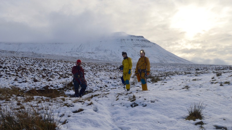 The morrow brought snow drifts on the heights of Ingleborough, Whernside and Pen-y-Ghent, and in view of possible icy conditions on the Bullpot farm road, we decided to go caving on Southerscales, a stone’s throw from Chapel-le-Dale. The sky cleared up mid-morning bringing bright sunshine on the white landscape. Eight of us departed the NPC in the minibus. We left the main road to go past Ingleton and onto the B road that leads up to the Ribblesdale viaduct. At Chapel-le-Dale, we parked on the side of the road by the start of the nature trail which climbs on the western slopes of Ingelborough.