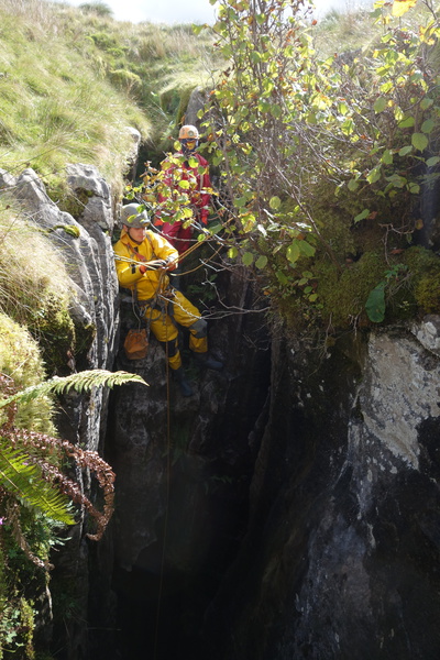 James, Rhys and Mr Jack arrived and Diss rigged the pointless final pitch. Satisfied the dig still didn't go, we retreated up, Diss de-rigging competently. Soon we were out, to find James had gone to push a nearby streamway cave (turned out to be Jingling Cave). We decided to leave him there, but he emerged in time and we walked down the hill together.