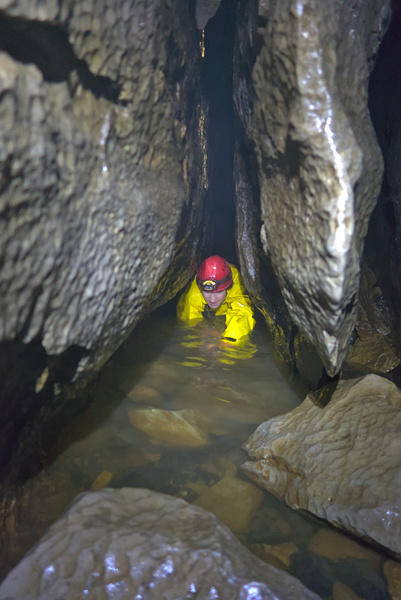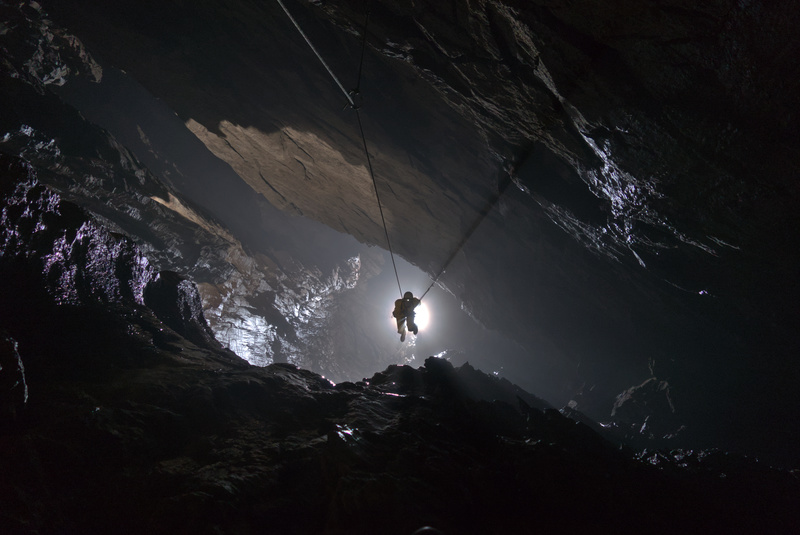 Bottom of the first pitch is a bit moist, but the second is just around the corner. An up-traverse leads through a hilarious little squeeze – don’t do what I did and try to squeeze alongside your tackle sack (I’ve made of habit of doing that… King; Winter Tour…), but rig the rope first, clip the sack (and yourself) onto the rope, and then squeeze through. You’ll be birthed onto an awesome overhang overlooking a frighteningly deep abyss. I think there were three deviations, but I only put in two, and we only needed one. In wetter weather it could well be quite moist though so remember that the first one comes sooner than you expect (or don’t - I quite enjoyed bouncing off the walls trying to catch the tat further down).