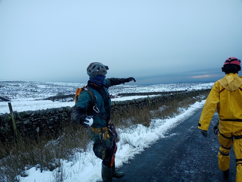At the car park we realise – literally no one had chest harnesses. How could this have happened? While Chris had carefully laid out 12 complete SRT kits using all of the tree training kit during the day on Friday, he didn’t include chest harnesses in these assemblies. We all knew this… but didn’t then make the connection to actually bring chest harnesses to the bus on Friday. Big faff ensues: I decide we should try to use our slings we have as makeshift harnesses, Tony Seddon rolls by, we beg him for harnesses, he leaves, it transpires we have just enough slings to get by. Finally the first group go ahead and begin the walk up the hill to rig the entrance pitches. We have another snowball fight, during which I take care to dodge all snowballs and throw none, and eventually start our journey up the hill as well.