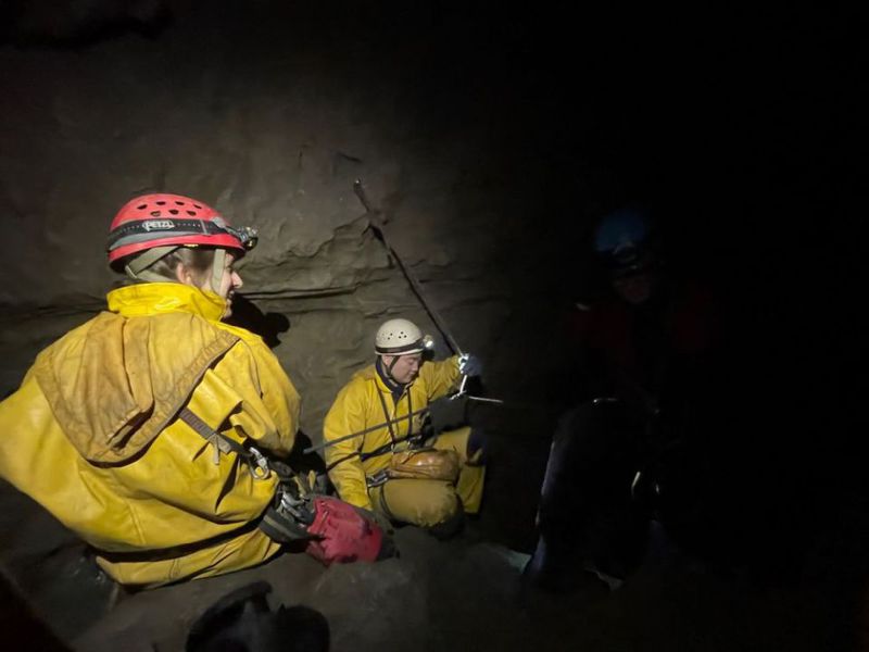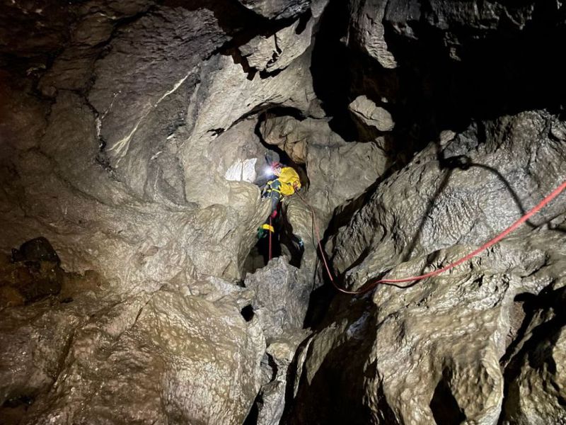 Everything was a bit chaotic, but for a first-time rigger it was probably inevitable. Halfway through descending, I realised with astonishment that my helmet was just sitting on my head with the strap open, blimey. Every rebelay I rigged ended up with intertwined ropes that needed to be untangled by undoing the maillons, so it took me a significant amount of time to reach the bottom as people froze in the winter breeze. At the huge chamber we waited for the Big Meanie team, hoping to see a light somewhere above our heads when they appeared behind us, descended down the same route as ours. Turns out Kevin got stuck at the top of Big Meanie (“Fuck Big Meanie”) and with the help of Perry’s pulley and pulling he got out after half an hour. He was fine, but his welly was not. It was almost decapitated and its back sliced open. Brutal.