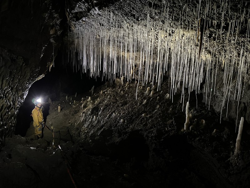 The way onwards was through two waterfalls, where again, my trusty bothy came in clutch, shielding me perfectly from both downpours. James was a little uncertain as to the way onwards when we reached the T junction, and we incorrectly turned left. This led to us having a great time in some brilliantly thick mud before finally consulting the description and turning around. A short constriction to the left after the T junction became a stooping passage which narrowed before we doubled back on ourselves, climbing upwards and left to traverse two mud slopes. The way onwards was bearing right; however, I found an alternative route to the left through some fun crawls and a downclimb. A large walking chamber led to a sandy section where we took another constriction into a stooping passage, this time on our right.