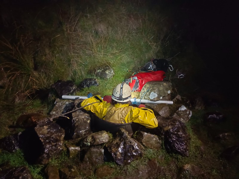 At the bottom of the topmost pitch I figured we were likely to be the last group out, so I let the others know that I’d derig bar and zoomed out, instructing Julien to take out the bothy bag as soon as he got out. Visibility was horrendous on the surface – barely 5m with heavy winds and spitting rain. I had to wander around a bit to find bar but once located I dove down with extreme speed. I would never usually advocate for speed caving but I must admit it was extraordinarily fun to race down the ropes (taking care not to glaze them of course), sliding directly on the greasy slab, bounding across the boulder chamber and onto the next traverse line to the pitch head. The way out was slower, naturally, but I was out within half an hour.