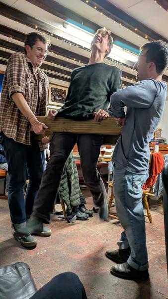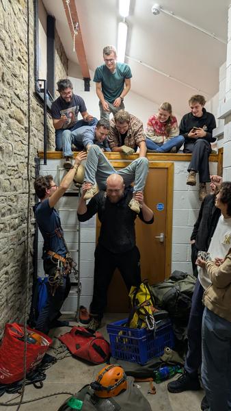 Back at the NPC, I was introduced to two games. The squeeze machine and aerial sock wrestling. Both are very entertaining to watch. We had the pleasure of watching Magor and Remi attempt to go toe to head through the squeeze machine, with a little help from gravity. It seems a masochistic exercise, given there was some screaming involved, but I see the appeal. Next was a few intense matches of aerial sock wrestling, with some attempts at fitting humans into tackle sacks between matches (they are surprisingly cosy?). We concluded our chaotic evening with some chitchat around the fireplace, which was really quite pleasant. I’m a big fan of the sense of community and friendship in caving soc, I think it’s quite special. A little while later, I was off to sleep and completely oblivious to how painful my muscles would feel the next morning. But that didn’t matter. All I needed to do was sleep enough to wake up before the dreaded cowbell."
