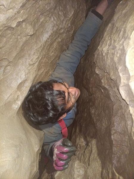 After another small pitch came a bizarre crawl into a twatty series of small tubes. These were nasty. Their windy shapes made it such that approaching them down the crawl was best done feet first, as the windy tubes sloped downwards, and were quickly followed by a two-metre downclimb through yet another tiny opening. At least this downclimb had some nice footholds. After this, an enticing slot in the floor presents itself, complete with a seemingly obvious spike to rig a handline off of, but after traversing over the top of the rift a little further down the chamber, a wider section allowed us to get down more easily. A large sling was just enough to wrap around another spiky flake thing and get us down a 4m pitch. Pretty odd this didn't have bolts, there's probably a better way down here.