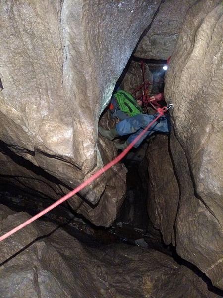 It was nearly turnaround time, but we just had long enough for me to rig the next pitch and see the top of Megatron pitch. I bombed down the next section, took an eternity to rig the rebelay in the middle after getting royally tangled, only to find that the entire pitch is directly beneath the loose pitch head and so had to wait even longer to call rope free as I then rigged the top of Megatron down to the ledge a few metres down.