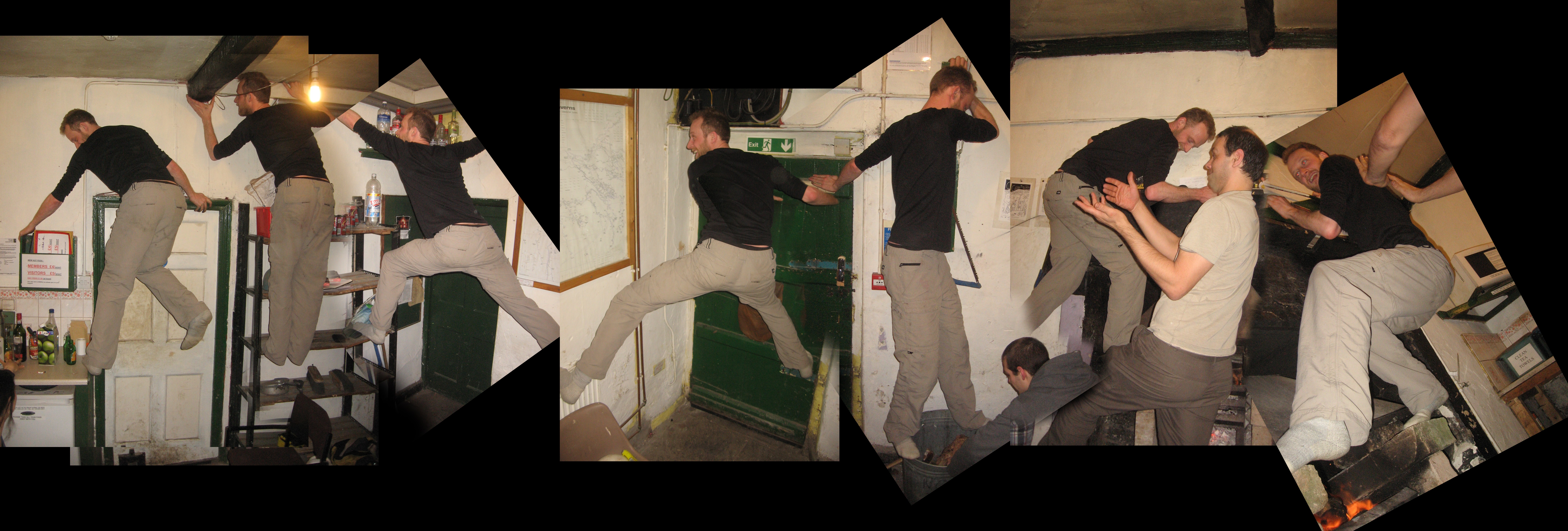 After dinner we all relaxed around the fire immobilised by Janâs 10,000kCal treacle tart, put on some music, and the night descended into chaos. You know, those caving games that invariably involve squeezing into any hole of slightly reasonable size, and Jan's incredibly impressive triumphant room traverse.