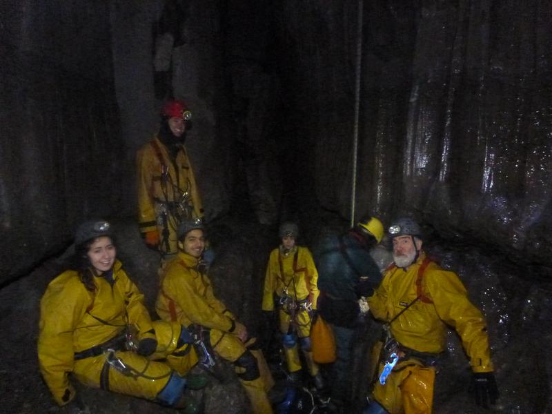 It definitely is wetter than it was on the descent. Climbing the first pitch washes my oversuit; it is scarily yellow by the time I've ascended past the drippy bits. I stand before the narrow slot that will lead to the entrance climb and the surface once again, and hear voices behind me: real voices, not imagined.